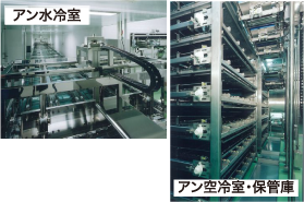 容器に詰められたアンは、自動的に水冷室に運ばれて、冷水で粗熱がとれた後、空冷室に入れられます。アンは出荷直前までここで保管されます。