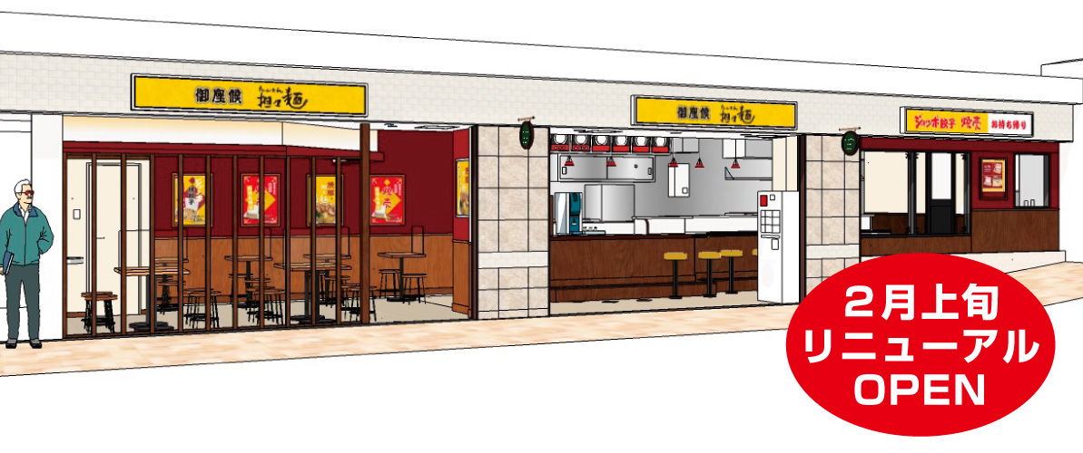 「担々麺」「ジャンボ餃子」などの店内飲食メニューは、2月上旬に客席を増やしリニューアルいたします。