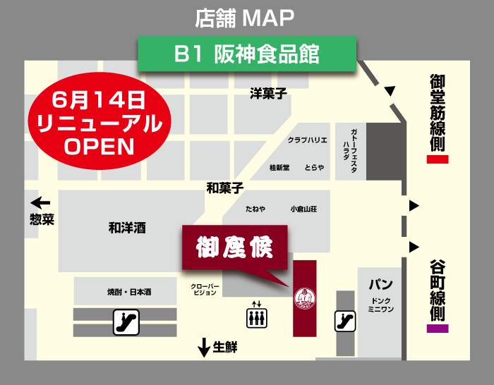 リニューアル後は、6月14日(火)より地下1階「阪神食品館」にてオープン致しますので、お客様のご来店を心よりお待ちしております。