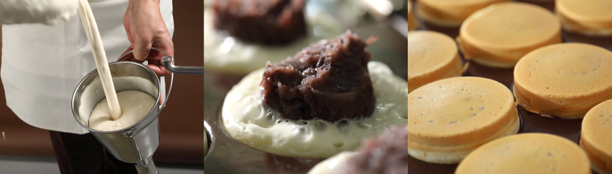新鮮なやわらかいあんこを、作りたての生地で薄く包むように焼き込める。